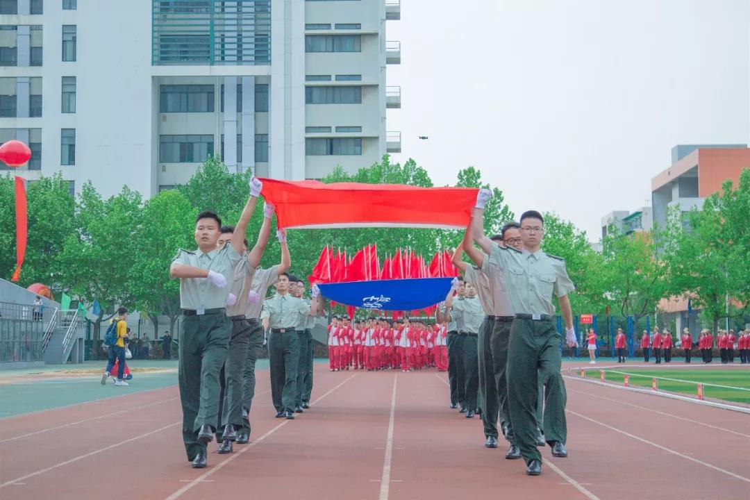 伴随着铿锵的口号,护旗手迈着矫健的步伐,带领着运动员方队和裁判方队走来。整齐的步伐,统一的服装,运动场上演绎出一幅美丽的画卷。全体师生向朝霞中的五星红旗行注目礼,五星红旗在庄严的国歌声中冉冉升起。
