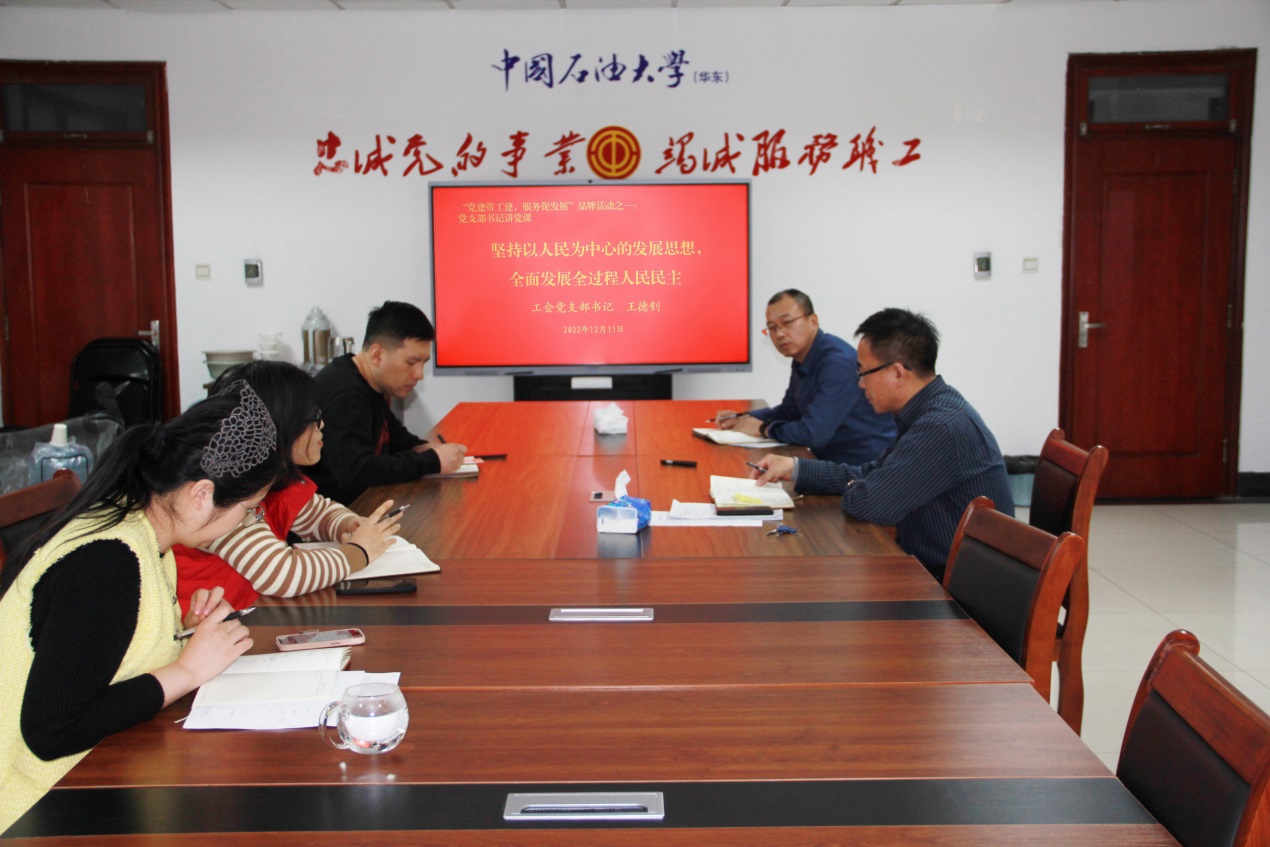 为提升工会政治站位,推进支部规范化建设,提高党员思想素质和服务本领,工会党支部推出了“党建带工建,服务促发展”品牌活动。2月23日,工会党支部书记王德钊以“坚持以人民为中心的发展思想,全面发展全过程人民民主”为题,为全体党员讲党课,开启了系列活动。