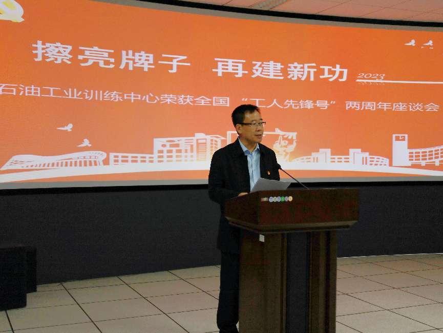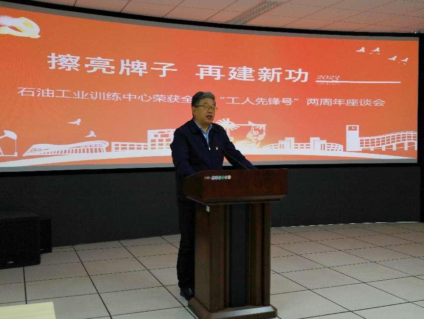 为大力弘扬劳模精神、劳动精神、工匠精神,提升工人阶级先进性、发挥工人阶级主力军作用,激励广大职工凝心聚力、再创佳绩, 4月27日,校工会联合科教集团举办“擦亮牌子,再建新功”——石油工业训练中心荣获全国“工人先锋号”两周年座谈会,慰问工训中心先进工作者。校工会主席王德钊,科教集团党委书记、董事长陈勇出席会议并讲话,校工会、工训中心以及科教集团所属各企业的干部职工代表参加座谈会。科教集团党委副书记、总经理吴天乐主持会议。