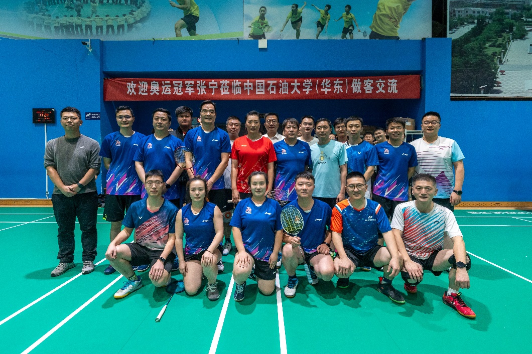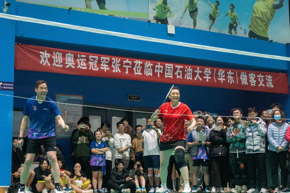 张宁与学校老师进行了表演赛,精湛的球艺和冠军的风采引来阵阵掌声,众多粉丝簇拥在张宁周围,石大师生有机会近距离感受到奥运冠军的魅力,这是羽毛球爱好者的盛宴。