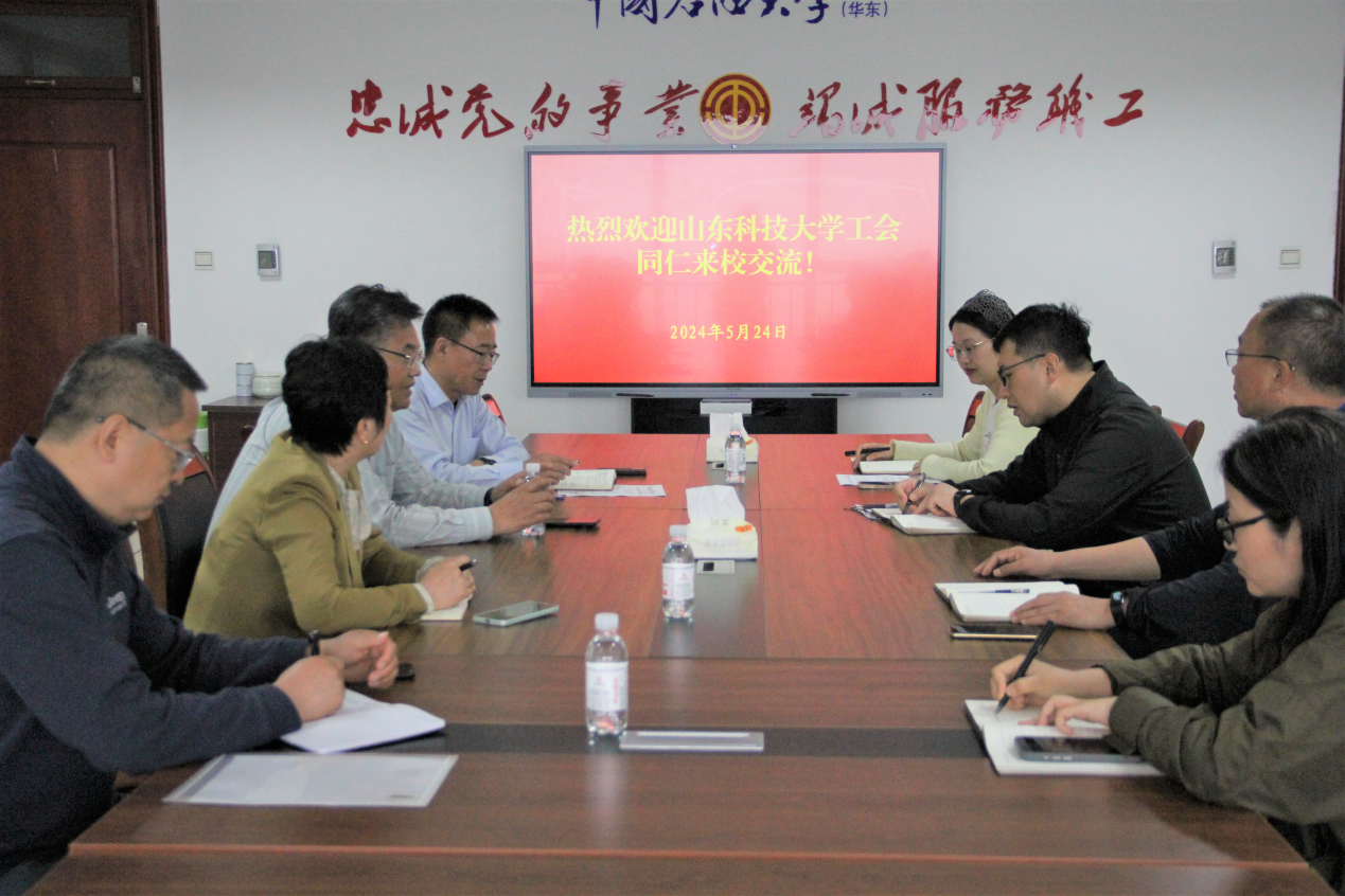 5月24日,山东科技大学工会主席李双立、副主席兼妇委会主任徐海燕等一行来校调研交流。校工会主席王德钊、工会副主席董发广等参加座谈。 王德钊对山东科技大学工会一行的到来表示热烈欢迎,并介绍了我校工会队伍建设、“全生命周期”服务教职工情况,以及探索“文体+思政工作模式”的体会。