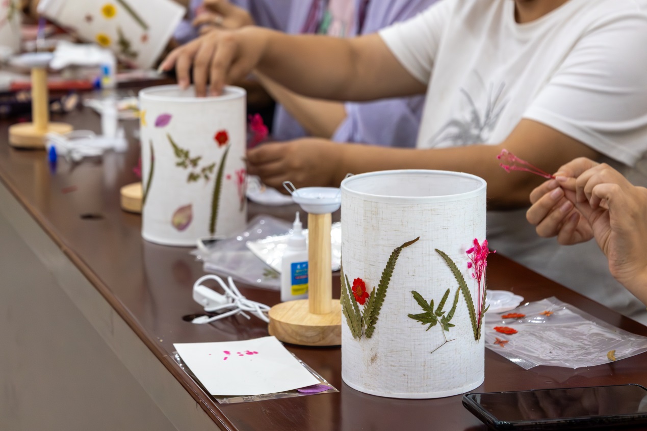 活动现场,专业的花艺师耐心讲解了压花台灯的制作方法和注意事项。随后,老师们拿起工具,小心翼翼地将一片片色彩斑斓的花朵与茎叶进行修剪与设计。他们精心布局,巧妙搭配,每一朵花、每一片叶都仿佛被赋予了生命,随着时间的推移,一盏盏精美的干花灯呈现在大家眼前。