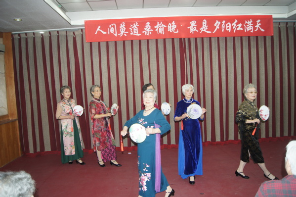 石板房舞蹈队广场舞和交谊舞烘托了现场气氛,舞姿优美,动作舒展大方。六位平均七十五岁气质上佳、仪态大方的女老师表演的旗袍秀,身着旗袍、手执香扇,婀娜多姿走出了老年人的风采。舞蹈队老同志们的风采正所谓“日出江山丽 花绽岁月香”,时光虽带走了青春却沉淀了芬芳。现场观众纷纷举起手机记录着精彩瞬间。