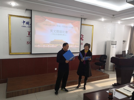2018年11月24日,马克思主义学院美文朗读比赛在学院会议室举行。比赛进行了积极动员,共有近三十人报名参加比赛,经过层层筛选,有七组老师进入到了决赛。以司江伟书记领衔五人评委会最终评出一等奖一个,二等奖两个,三等奖四个。刘长欣牛继玲老师朗诵的《四月的纪念》获得一等奖,宋海儆老师朗诵的《我愿意是激流》、张璐、谷晓云、徐越三位老师联合朗诵的《我的南方与北方》获得二等奖。